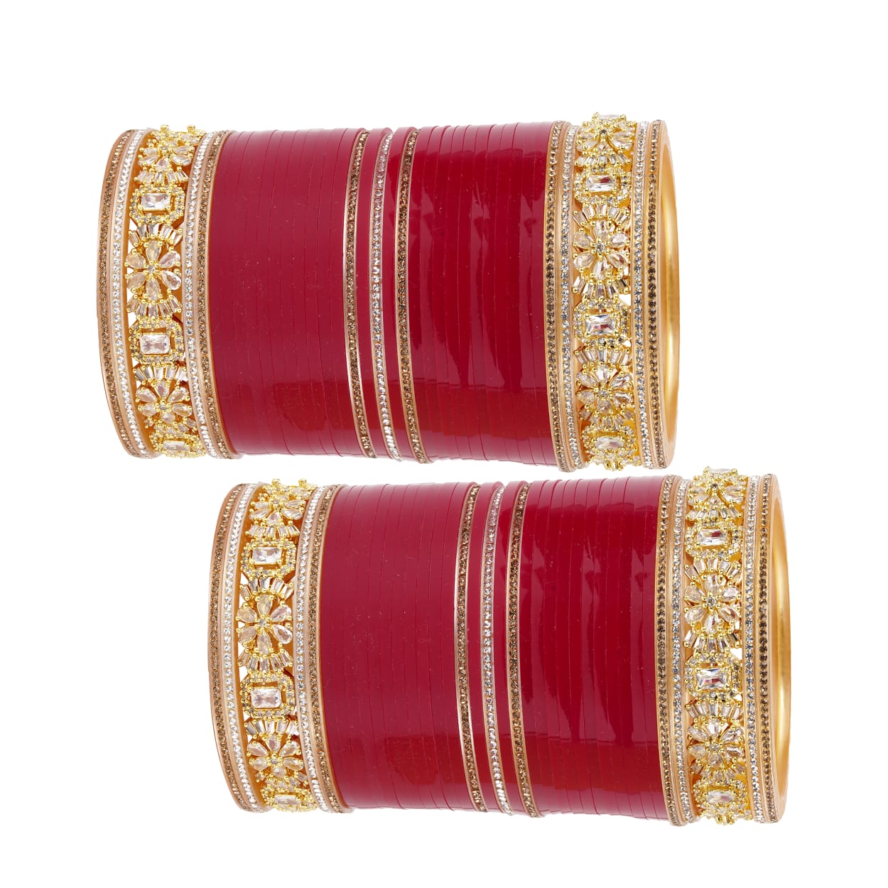 Exquisite bridal bangle set, beautifully crafted with shimmering stonework and intricate golden detailing. The premium design showcases a perfect balance of tradition and grandeur, making it an ideal accessory for weddings, festive occasions, and cultural celebrations. Designed to add grace and charm, this timeless piece reflects sophistication and royal artistry, ensuring you shine on your special day.