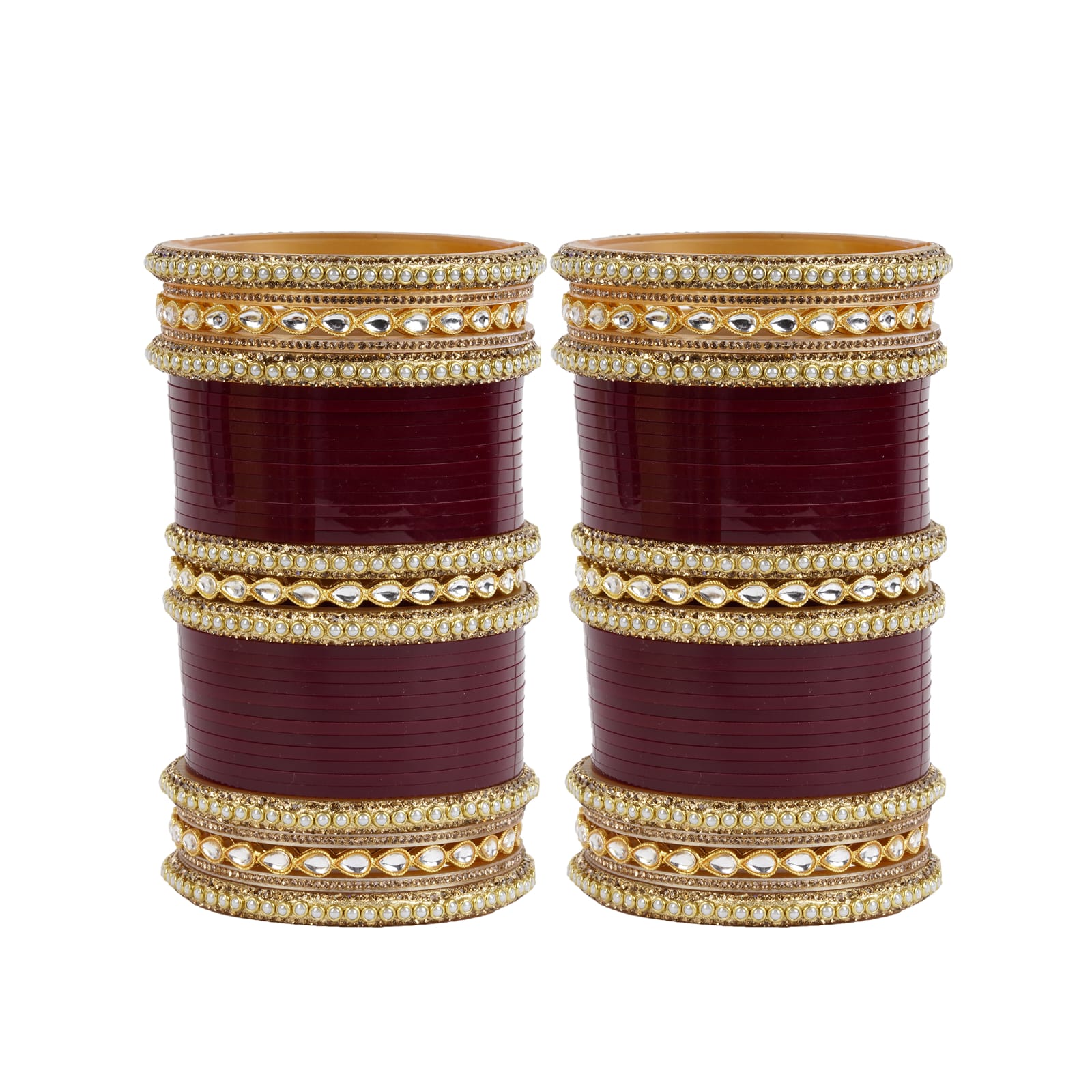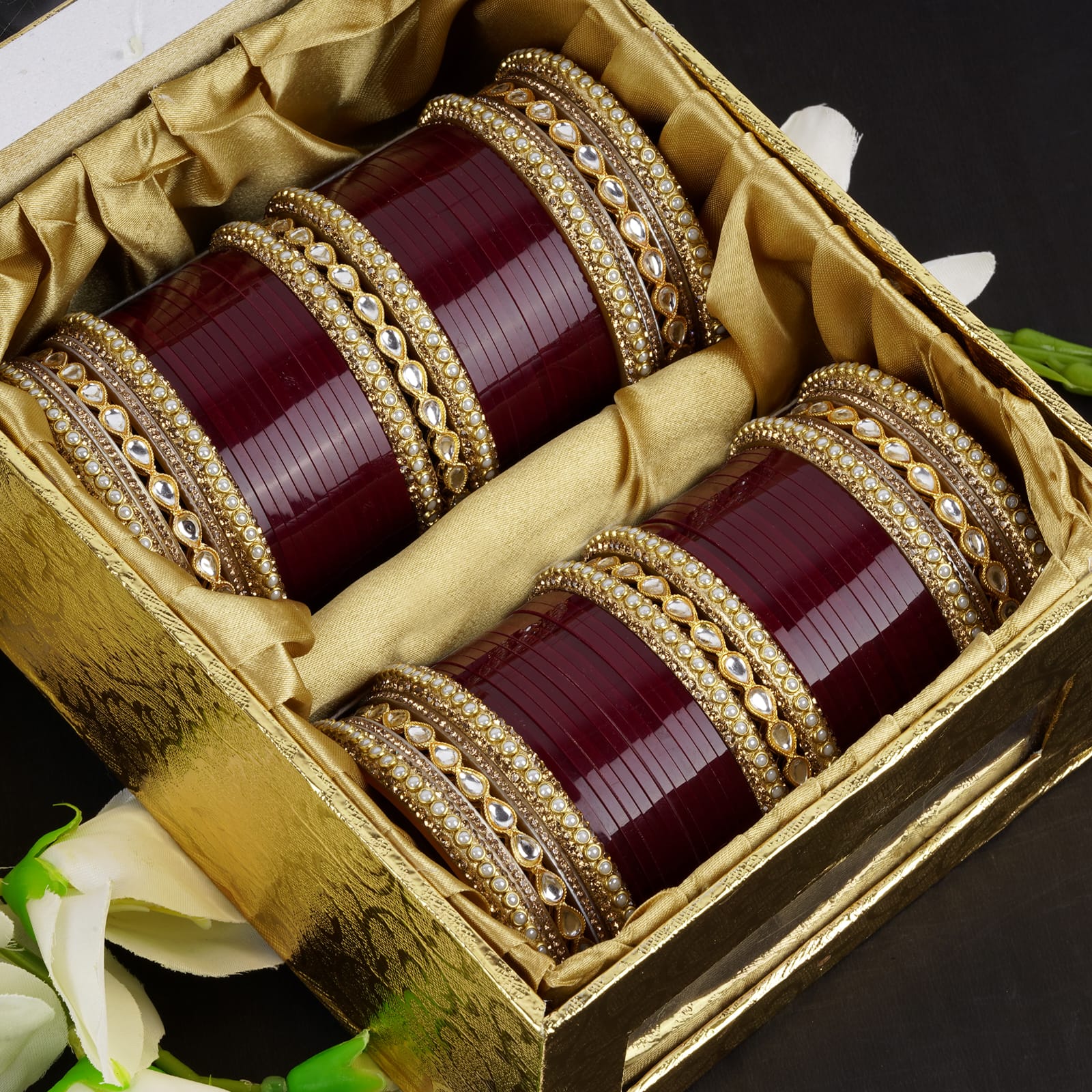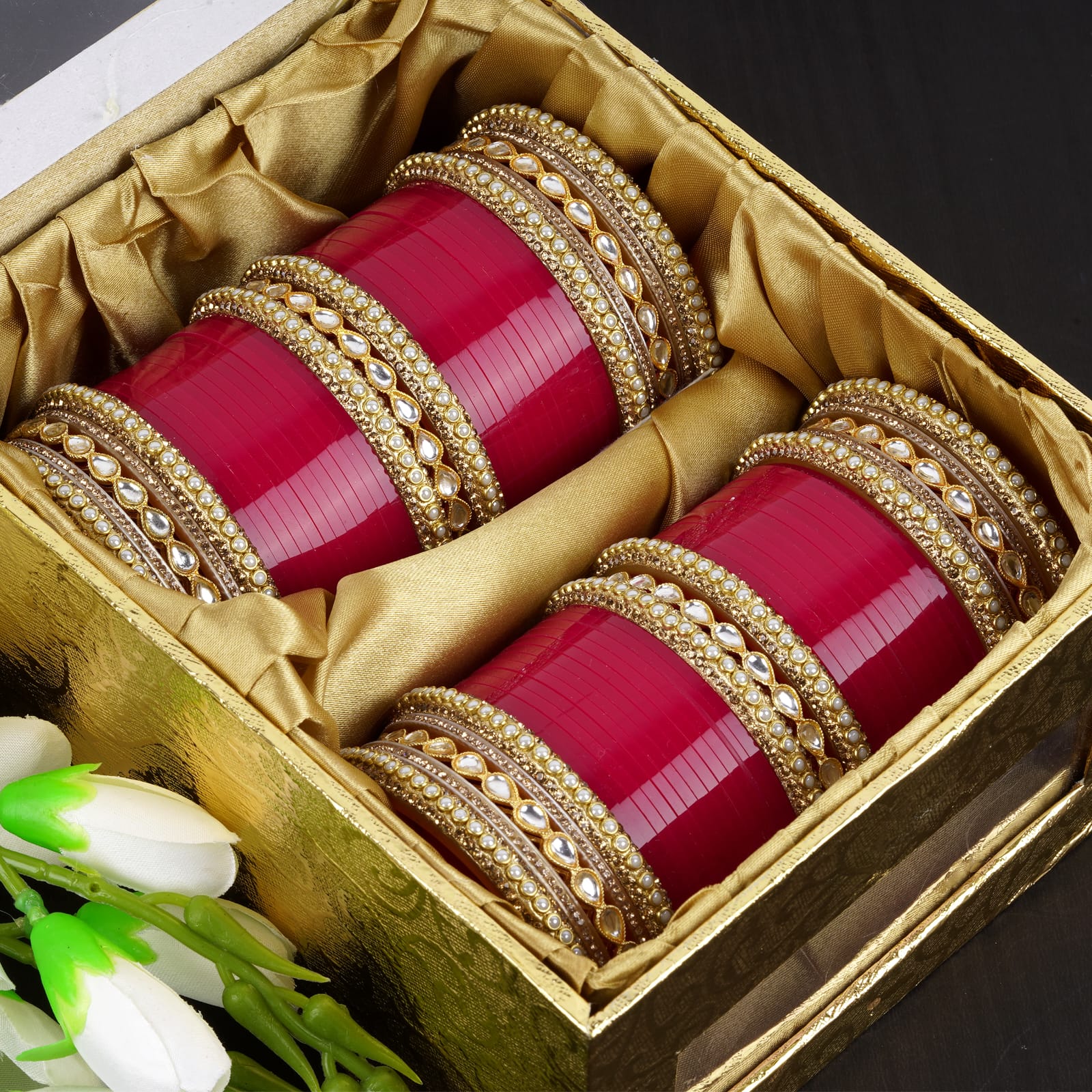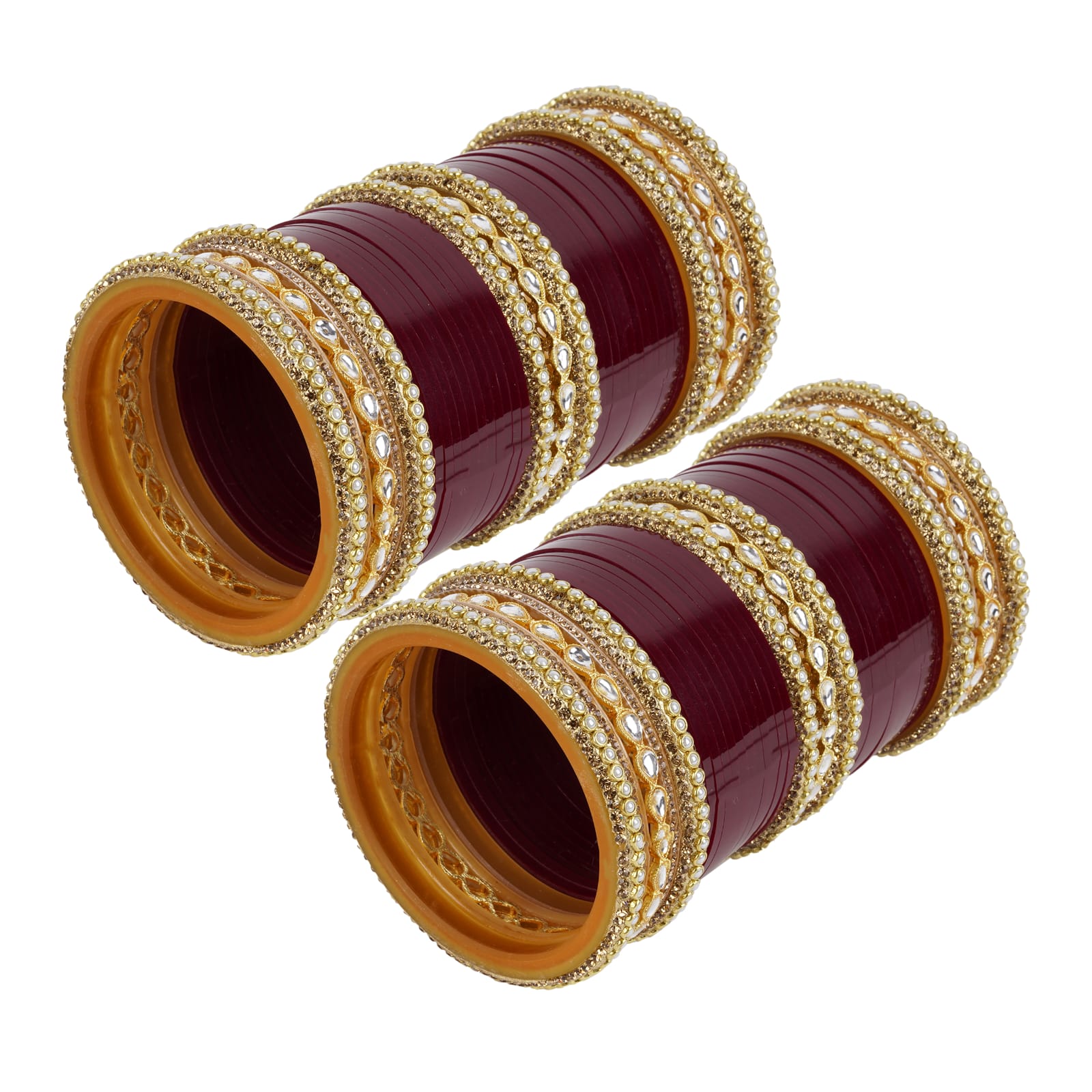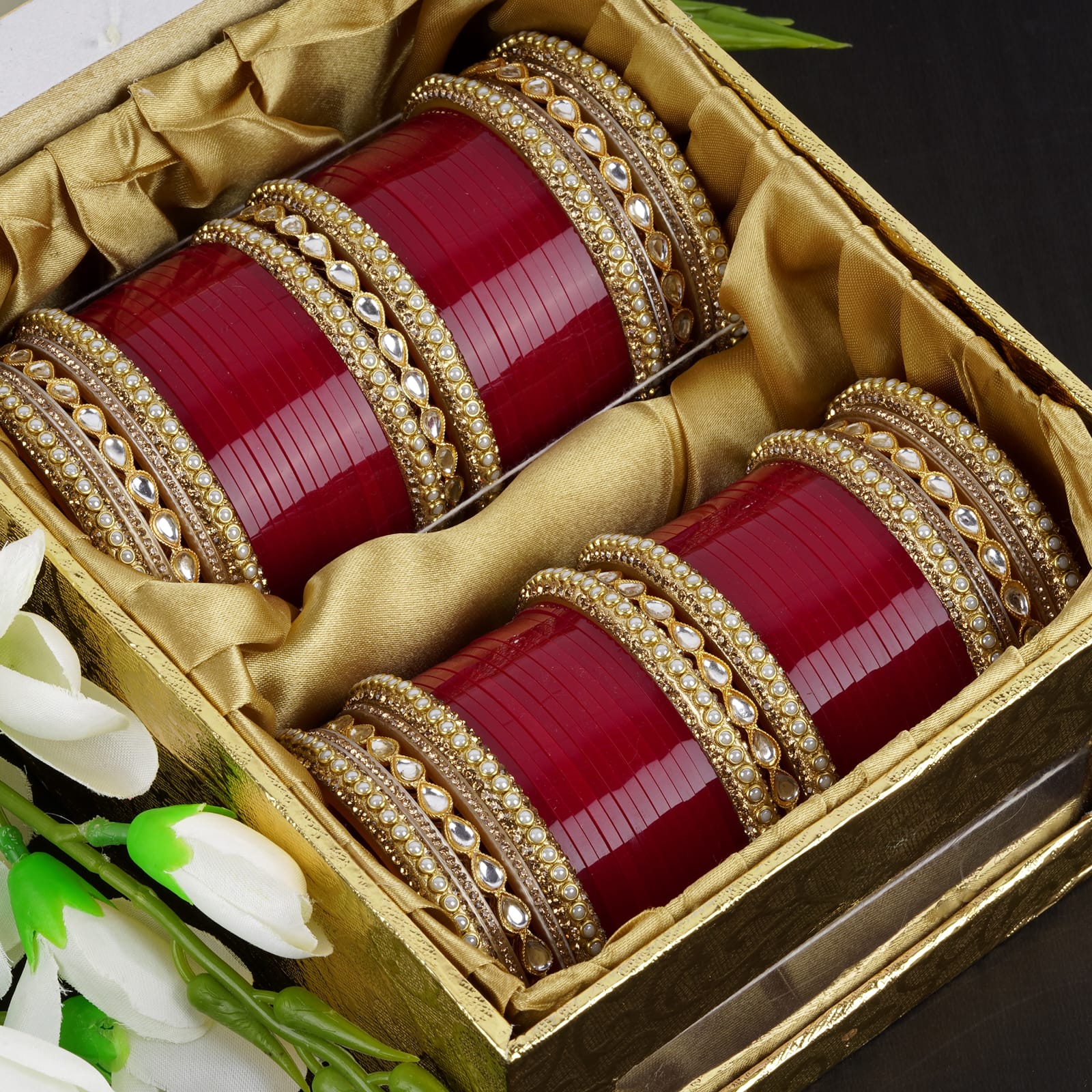 Bangle set is crafted with a rich glossy finish and adorned with beautifully embedded kundan-style stones. The intricate golden borders add a royal charm, making it a stunning choice for weddings, festive occasions, and traditional wear.Bridal Chura Designed to split from the center, this set offers both comfort and style while enhancing any ethnic outfit.