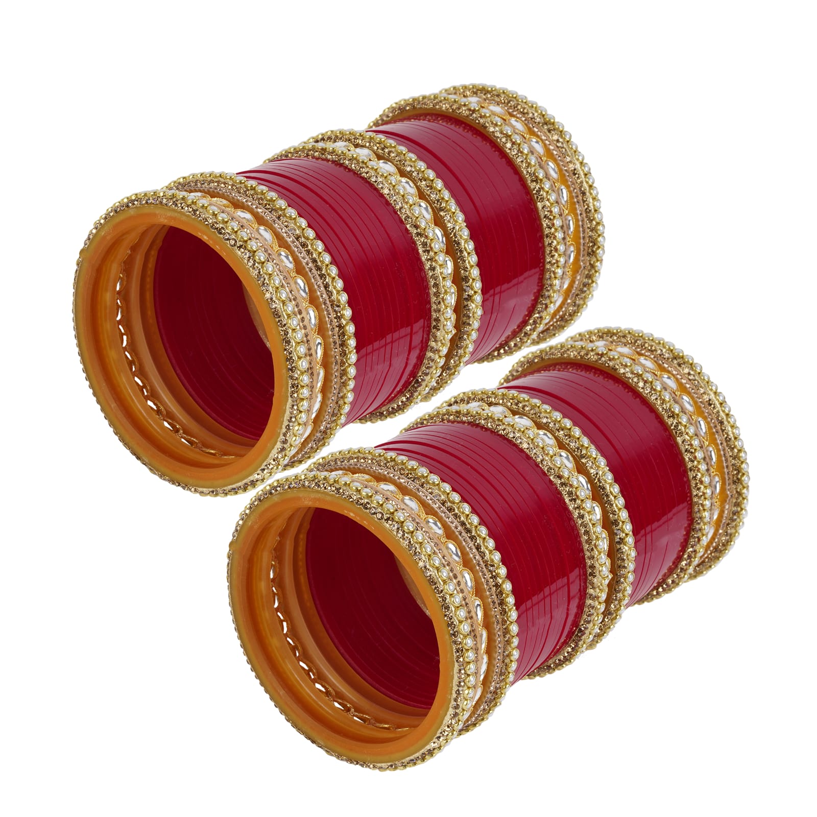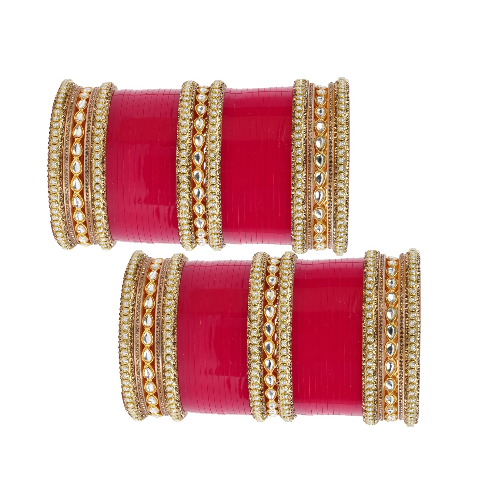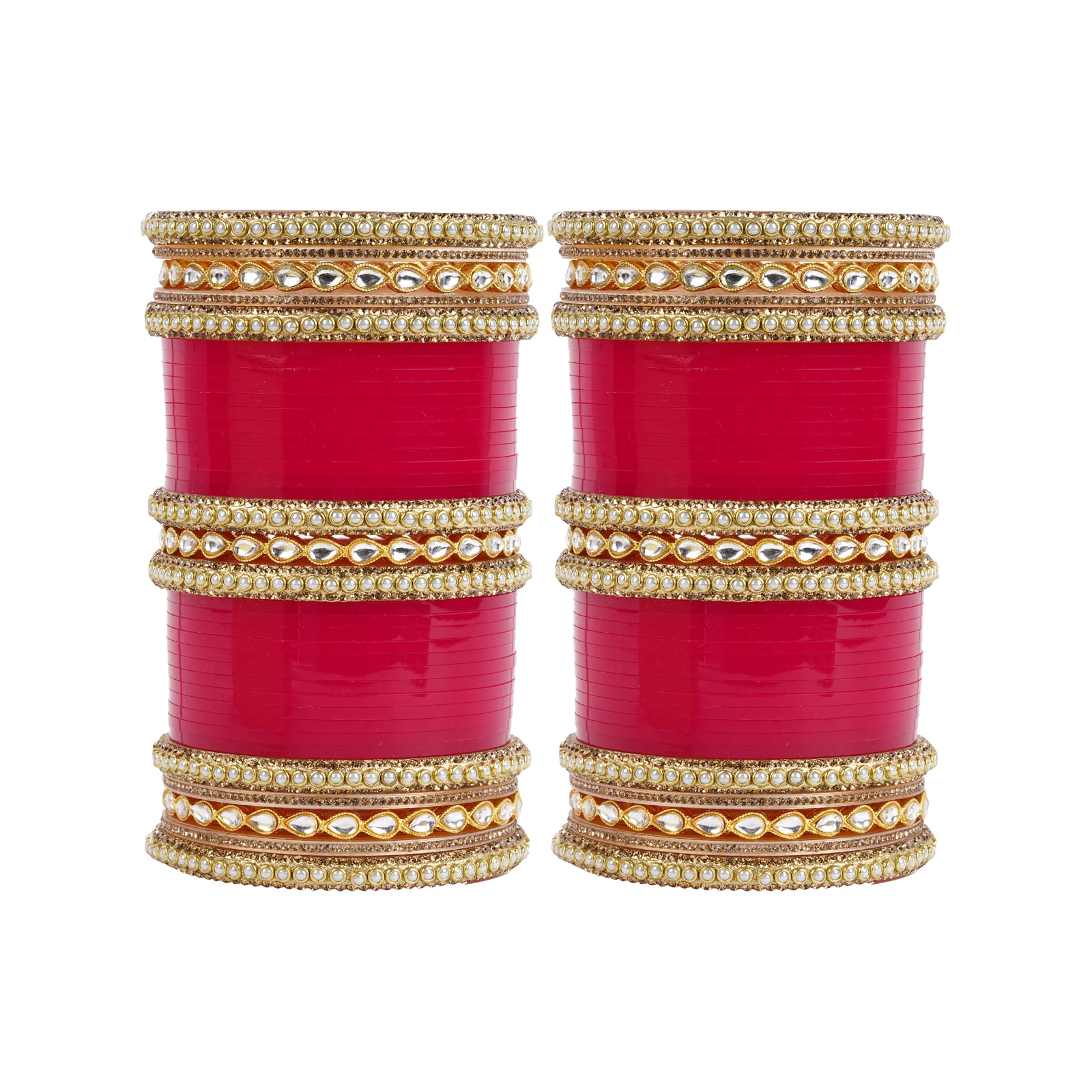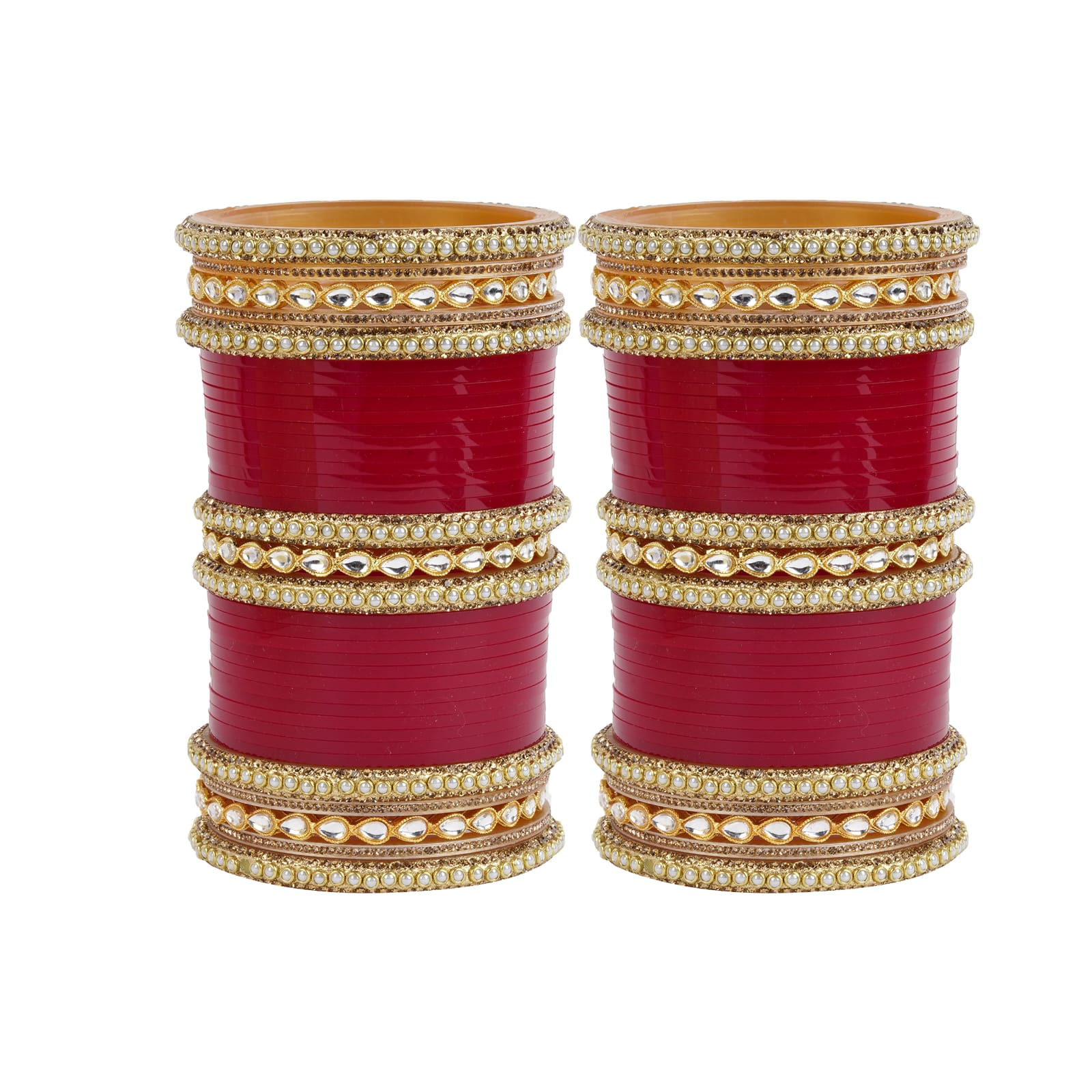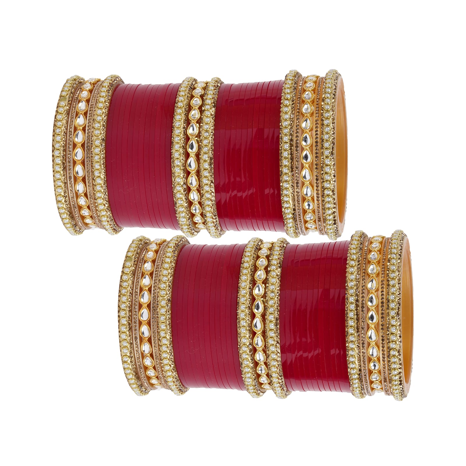 Bangle set is crafted with a rich glossy finish and adorned with beautifully embedded kundan-style stones. The intricate golden borders add a royal charm, making it a stunning choice for weddings, festive occasions, and traditional wear.Bridal Chura Designed to split from the center, this set offers both comfort and style while enhancing any ethnic outfit.