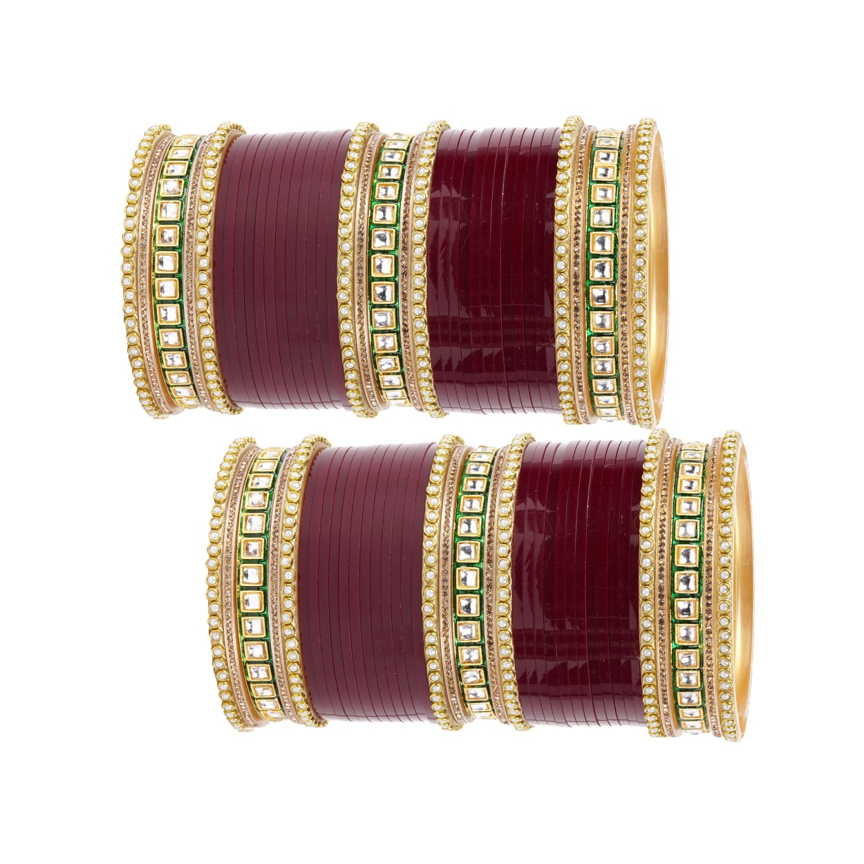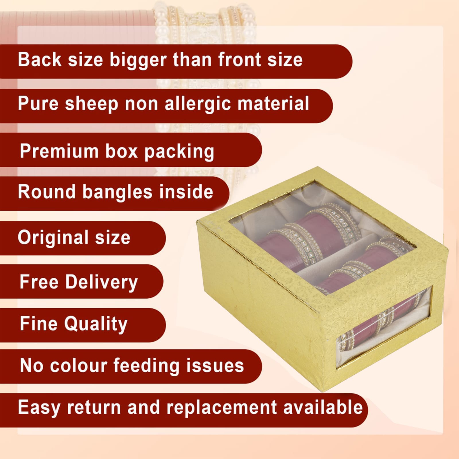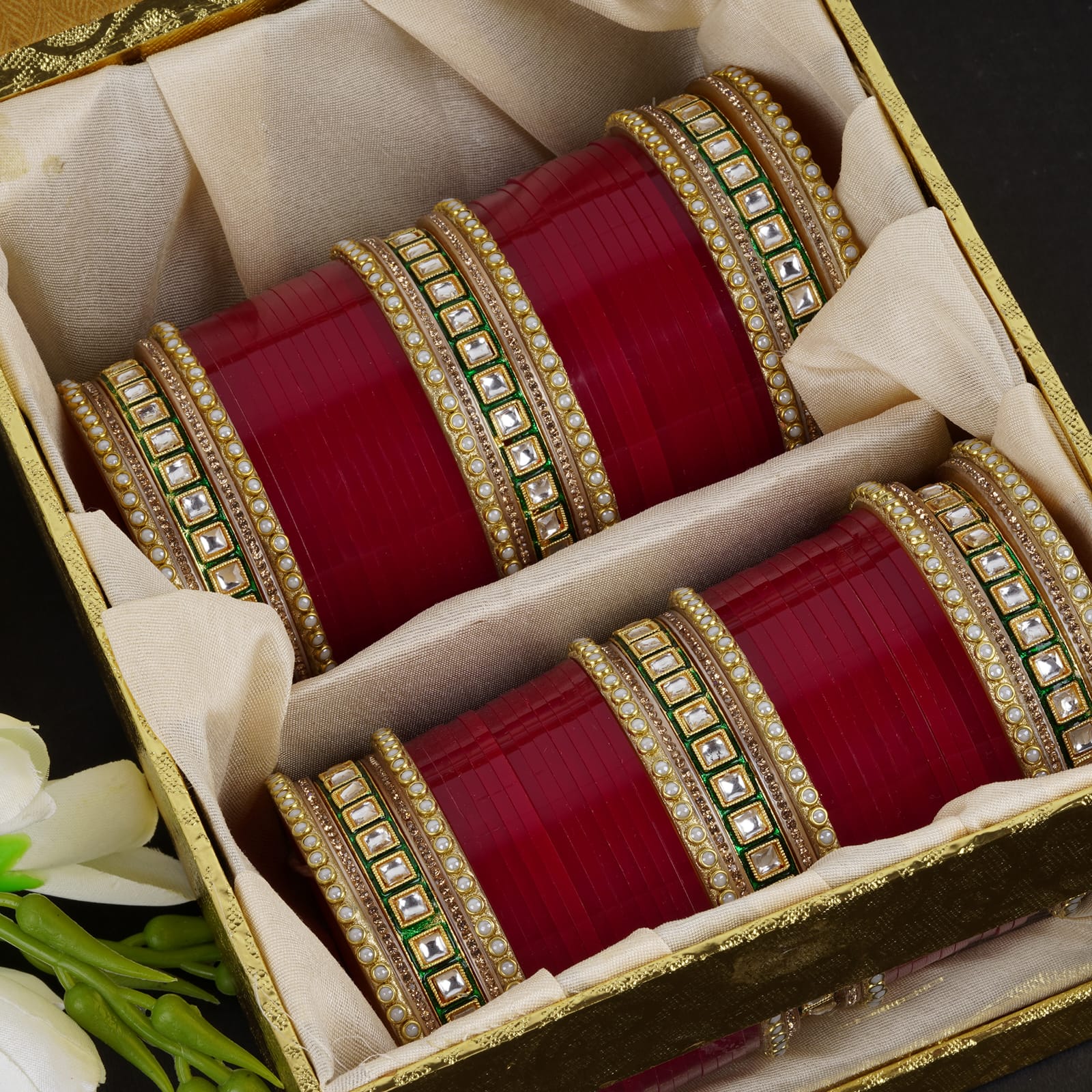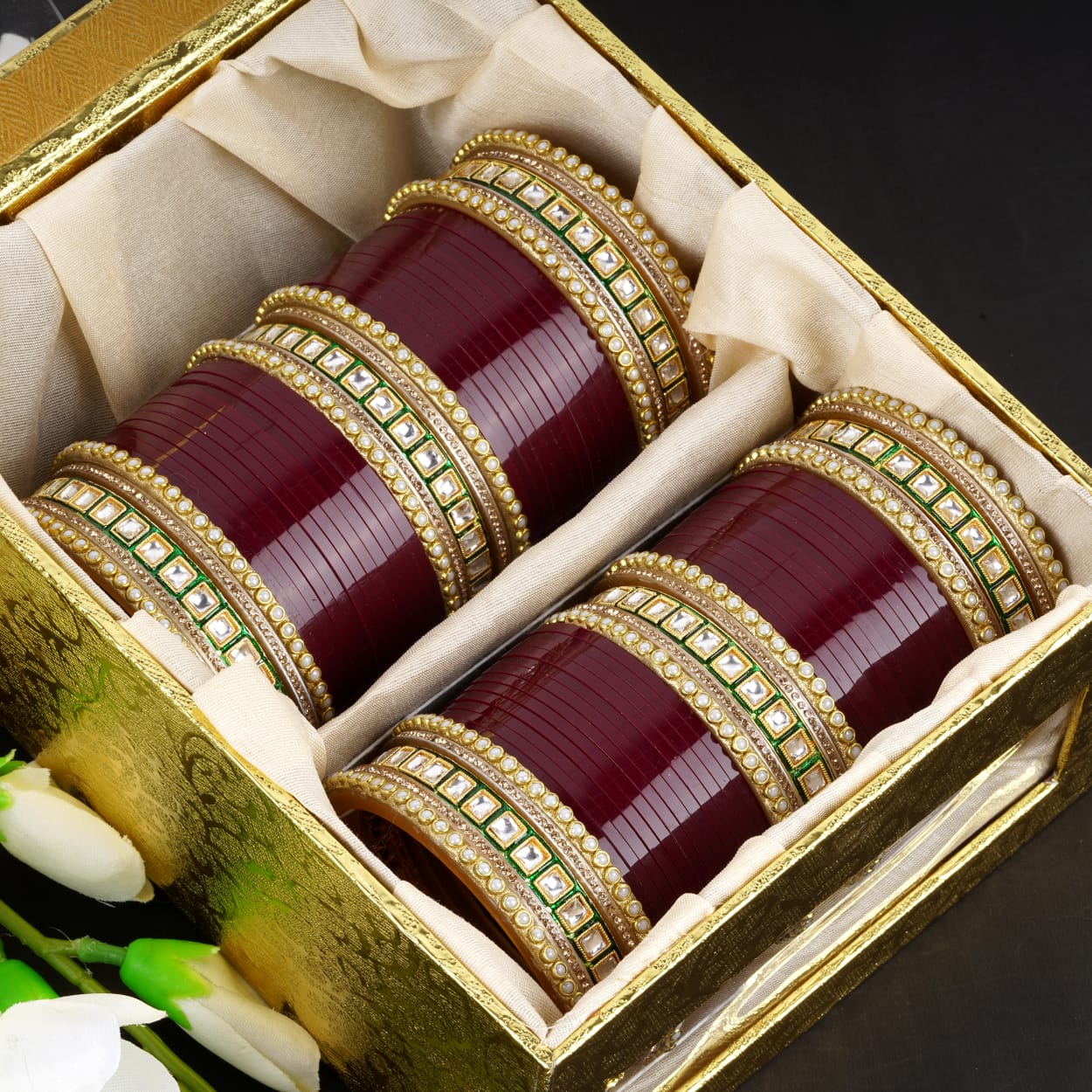 Traditional look with this stunning bridal bangle set, featuring intricate golden detailing and sparkling stone embellishments. The elegant design is further enhanced with fine kundan-style work, giving it a luxurious and timeless appeal. Perfect for weddings, festive occasions, and special ceremonies, this set blends heritage artistry with modern sophistication, making it an essential choice for every bride-to-be and ethnic fashion lover.