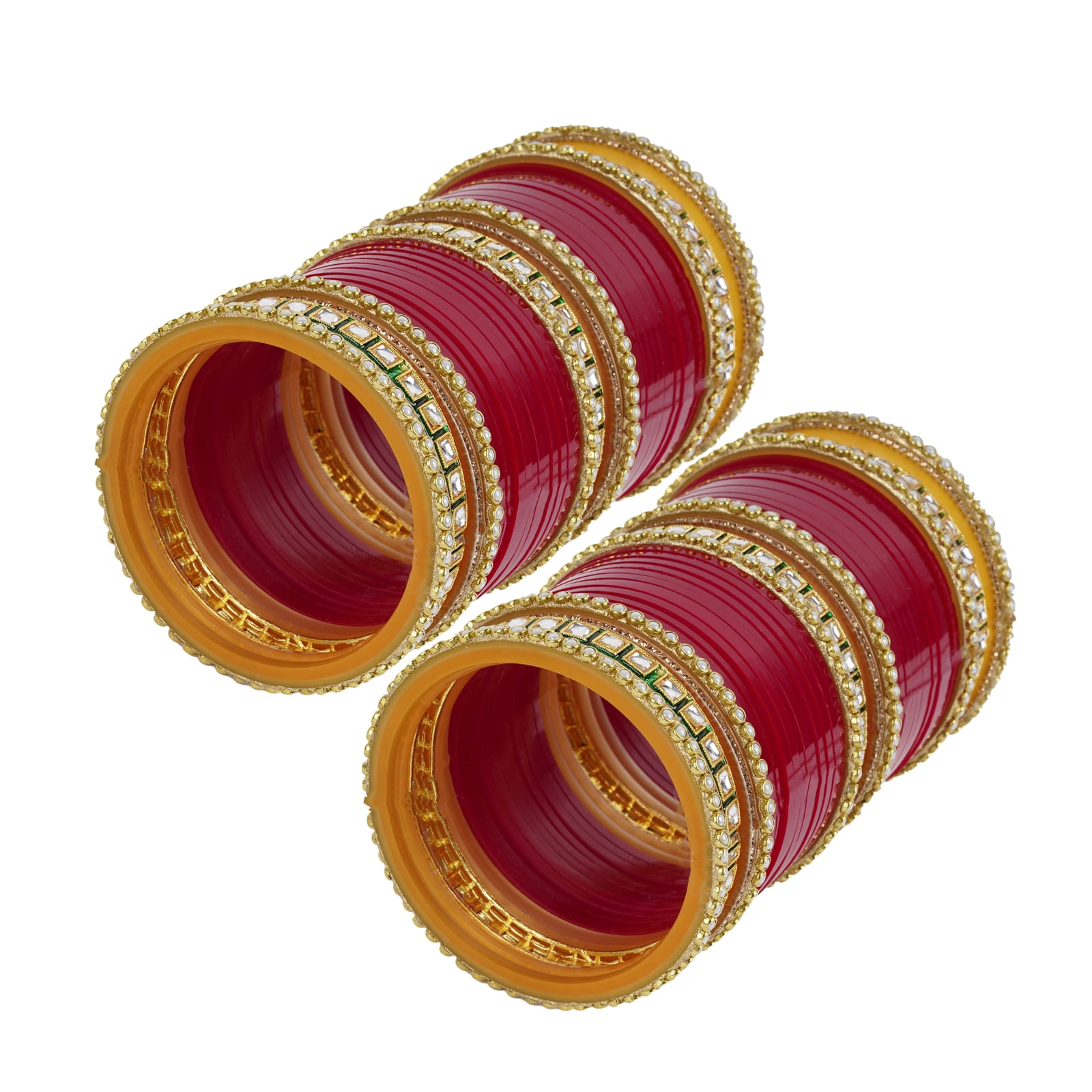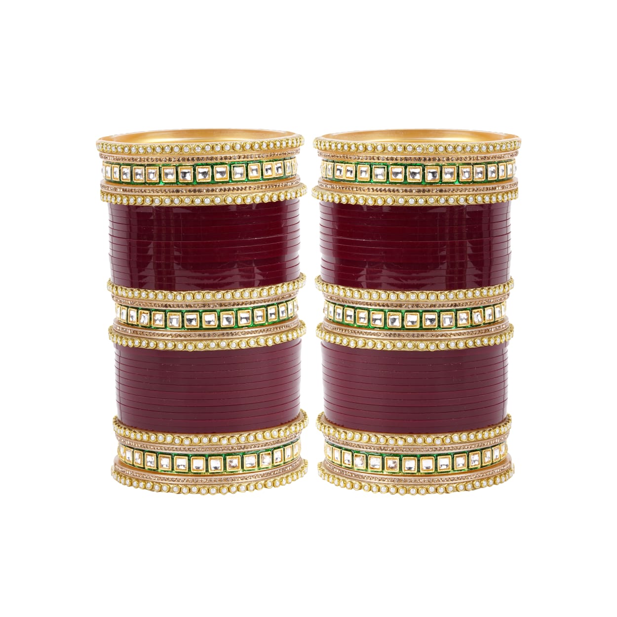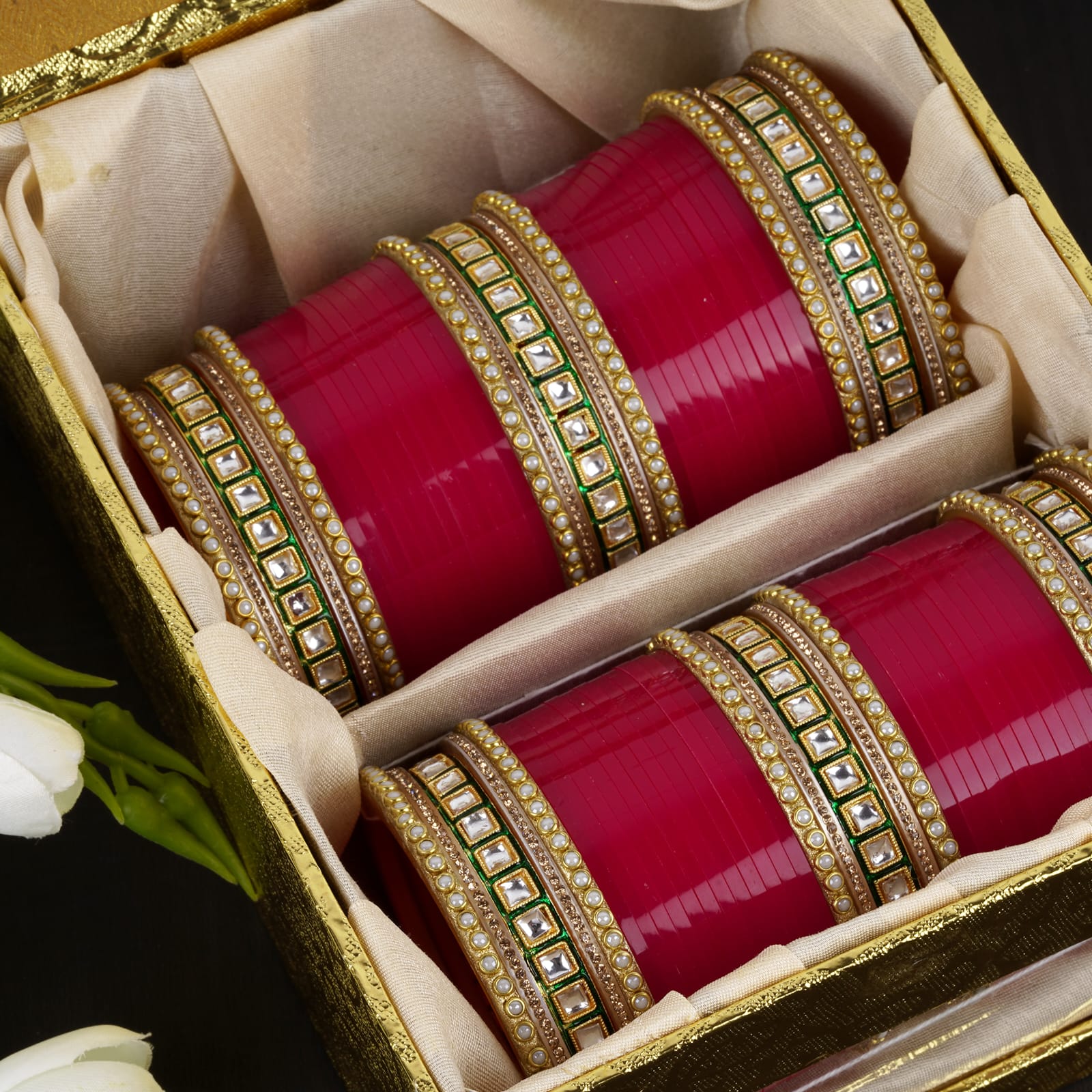 Traditional look with this stunning bridal bangle set, featuring intricate golden detailing and sparkling stone embellishments. The elegant design is further enhanced with fine kundan-style work, giving it a luxurious and timeless appeal. Perfect for weddings, festive occasions, and special ceremonies, this set blends heritage artistry with modern sophistication, making it an essential choice for every bride-to-be and ethnic fashion lover.