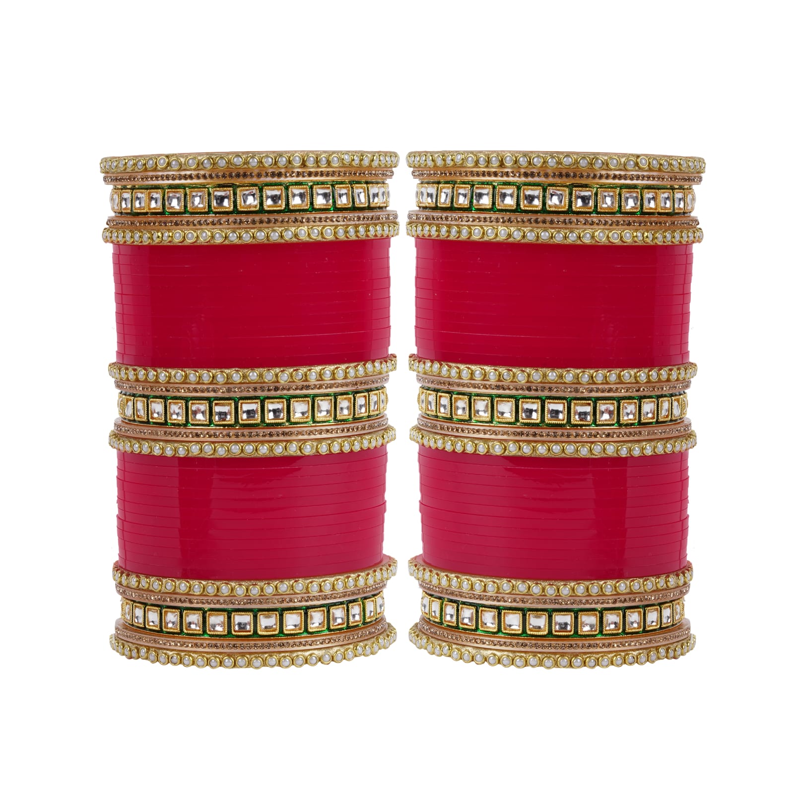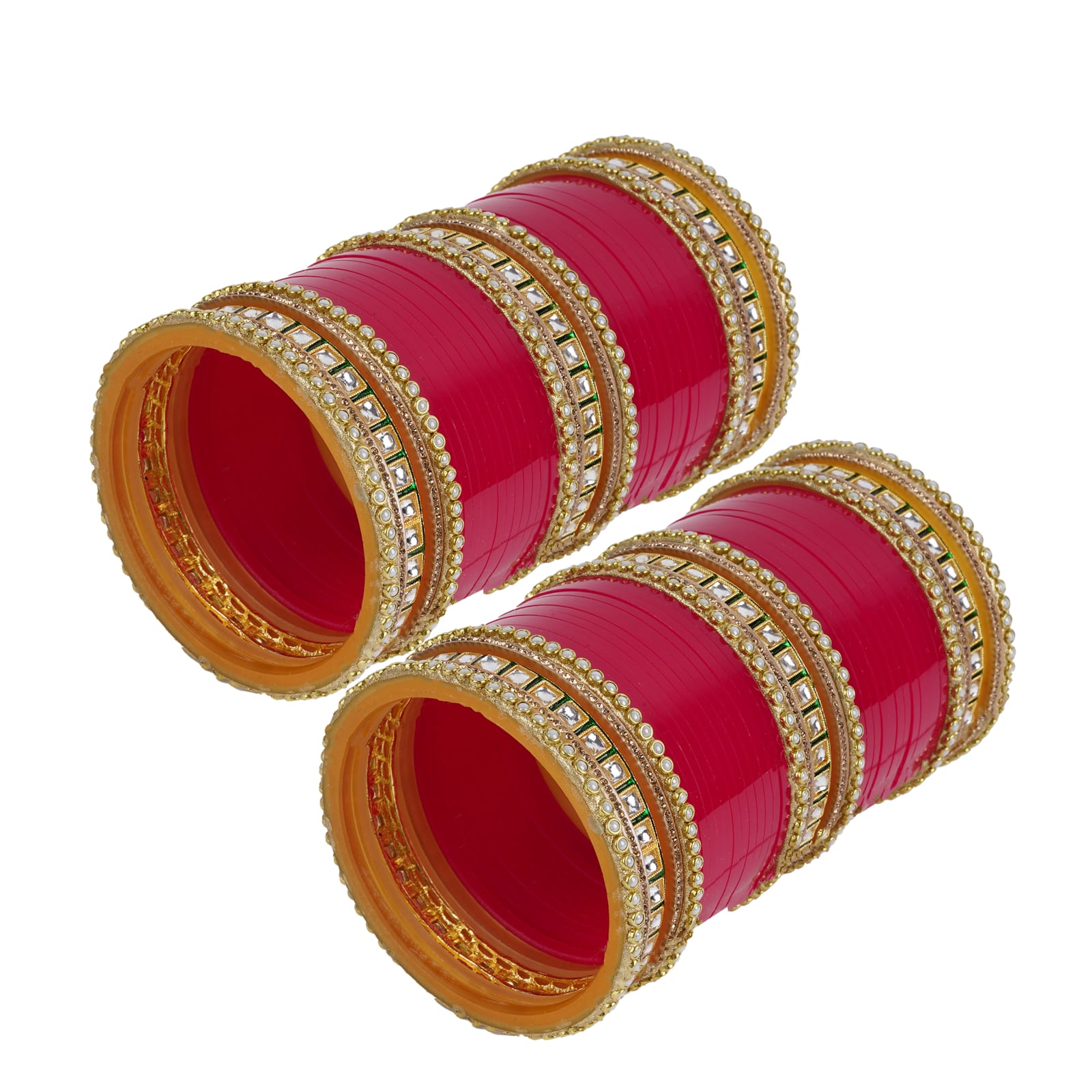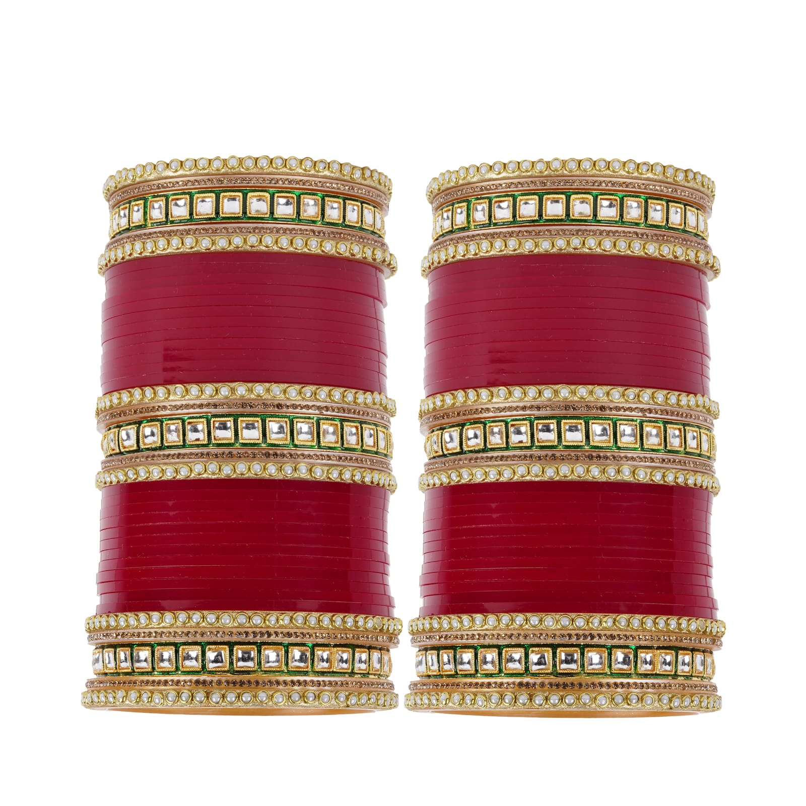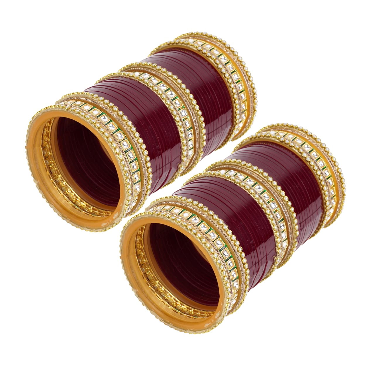 Traditional look with this stunning bridal bangle set, featuring intricate golden detailing and sparkling stone embellishments. The elegant design is further enhanced with fine kundan-style work, giving it a luxurious and timeless appeal. Perfect for weddings, festive occasions, and special ceremonies, this set blends heritage artistry with modern sophistication, making it an essential choice for every bride-to-be and ethnic fashion lover.