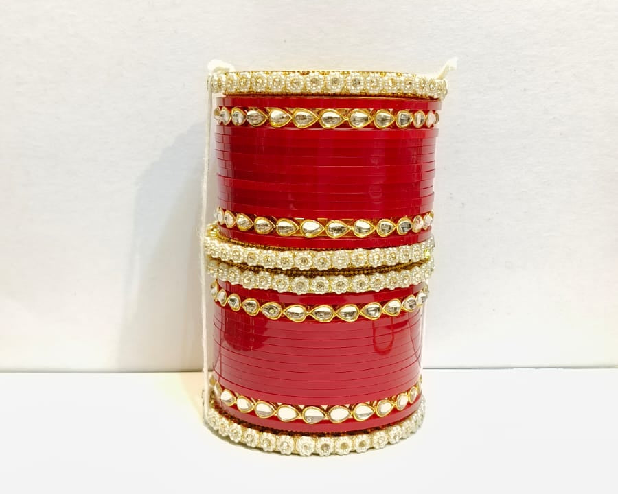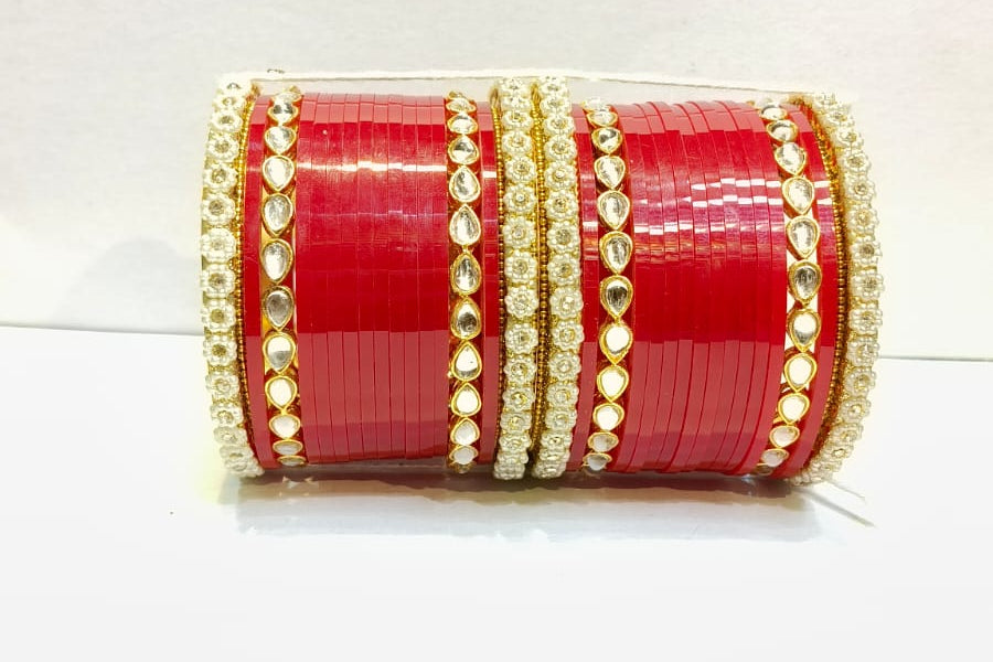 Elevate your party ensemble with this red-colored chura featuring intricate golden kundan work. Expertly crafted, it blends traditional charm with festive elegance,Chura Set, making it perfect for special occasions. The rich red Chura and sparkling kundan accents add a sophisticated touch, ensuring you stand out beautifully at any celebration. Designed for comfort and style, this chura enhances your festive look with timeless grace.